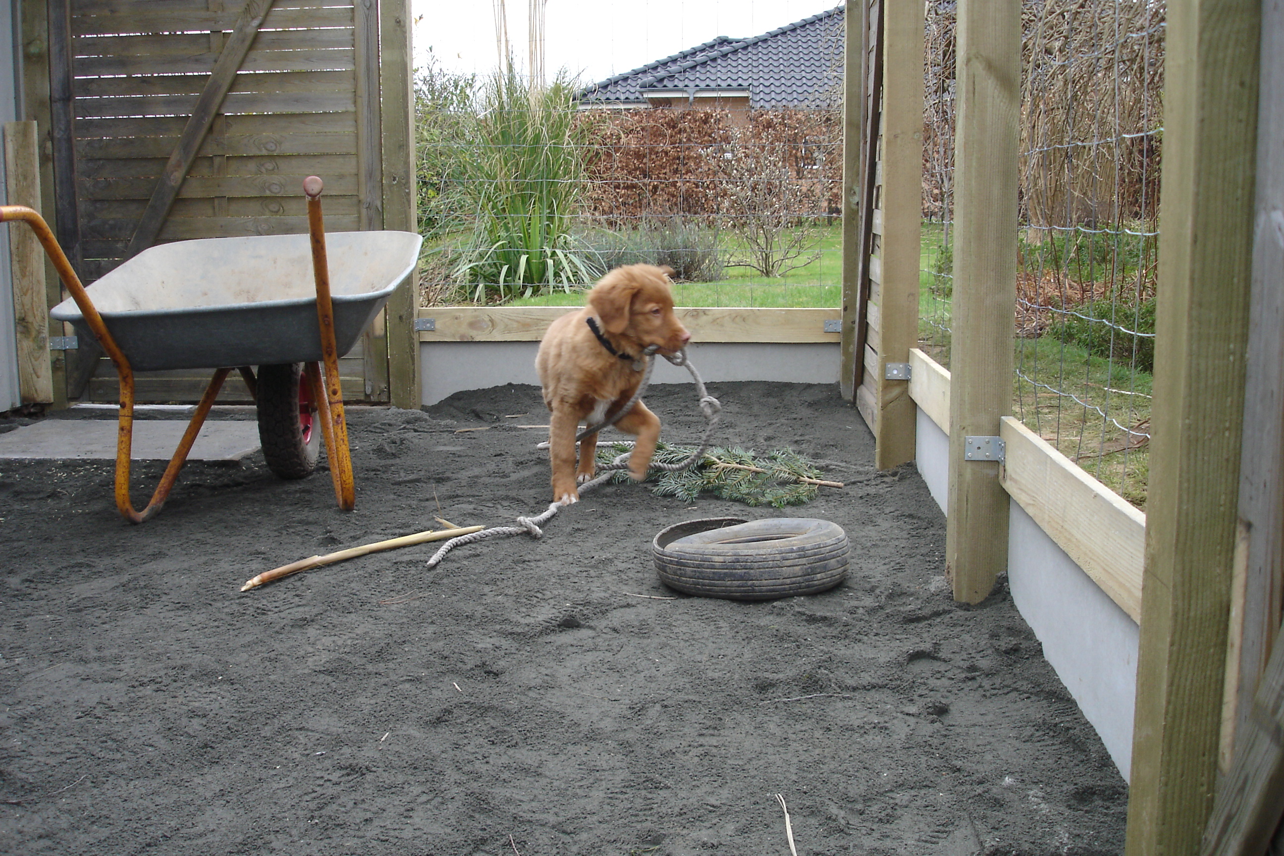 Hundegården er nu sat op, og mangler bare et hundehus og noget mere legetøj.